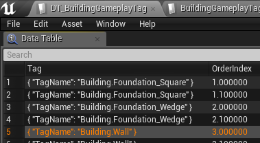 Then add an entry in DT_BuildingGameplayTagsOrder, this determines the order in which the pieces show up inside the UI. It accepts floats so you can insert between base game pieces by using decimal values. The lower the value the earlier on the list it will show.