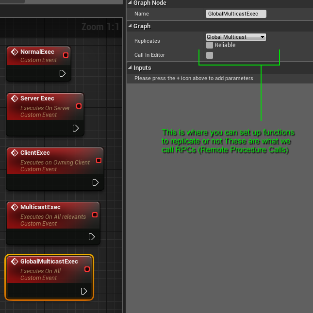 RPCs are functions in blueprints. If you want something to happen only on the Client or Server, you can use those replication-settings (we will show a number of examples further down the document for a more in-depth “how to use RPCs” look), and if you need something to be quick-fired to all relevant actors (usually players that can see the actor), use Multicast events.