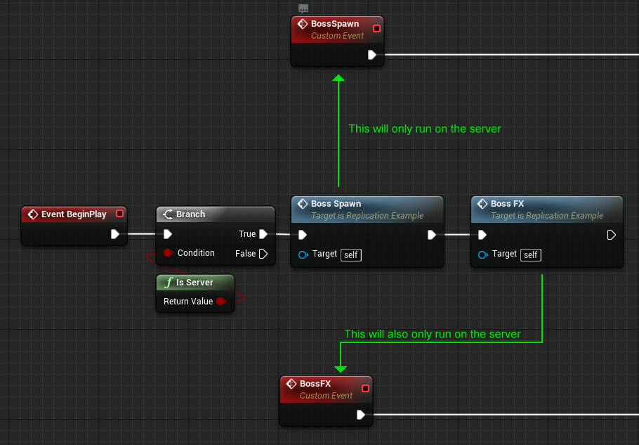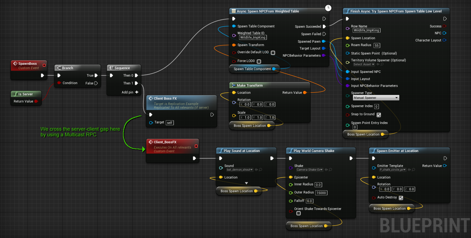 However - it is possible for another actor to perform a Cast to this actor and force run “BossSpawn” from both the server and the client, in which case we have a (potential) replication problem on our hands.