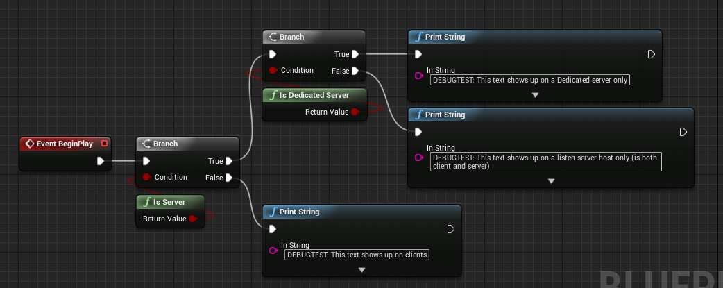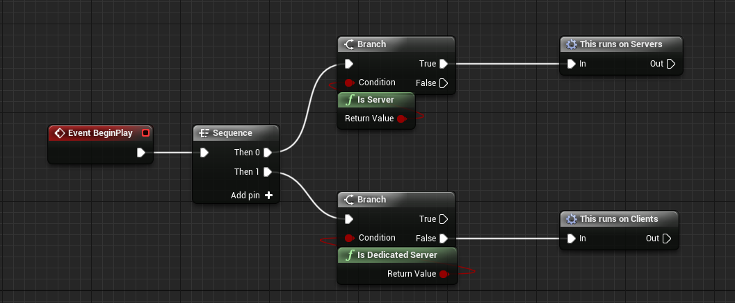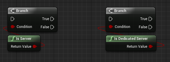 This is why you will see IsServer and IsDedicatedServer branching nodes in blueprints. If you aren’t familiar with these nodes or get them confused, we covered these at the very top of this document, and you should read that part first before moving on - knowing the difference is crucial and the prime source of confusion for many people.