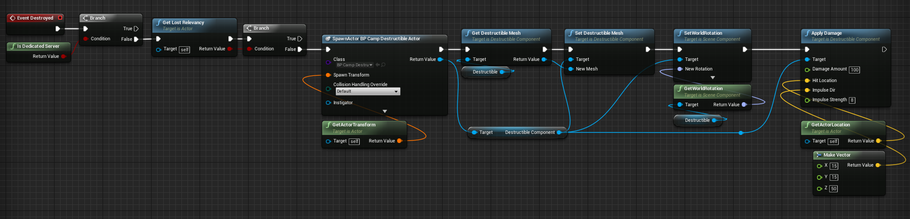 Note that this actor has a Destructible component called “Destructible” that has been set to Visible=False, and Collision=None. That is because we are using only the destructible mesh itself as a reference that we pass into the SpawnActor BPCampDestructibleActor function.