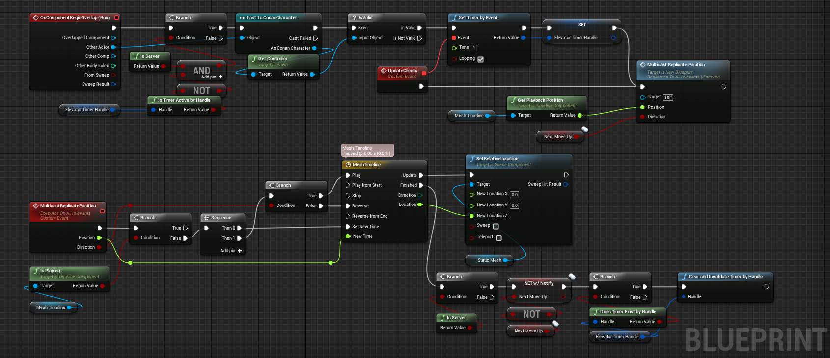Next, we Set Timer by Event and store the timer variable in “Elevator Timer Handle”. We set the time to check to 1 second because we won’t need a more frequent update in this case . The main reason is to send updates to players that joined during the movement, so they see the same progress as players that have seen it at the beginning.. Finally, we link the timer to the “Update Clients” function that Multicasts a position to clients. The position is taken from the “MeshTimeline” component and we obtain the current time from the server (Get Playback Position), as well as if the direction it is going is up or down (“NextMoveUp”). These are the only two things that the client needs to know about. The “NextMoveUp” boolean is an OnRepNotify that we will deal with shortly.