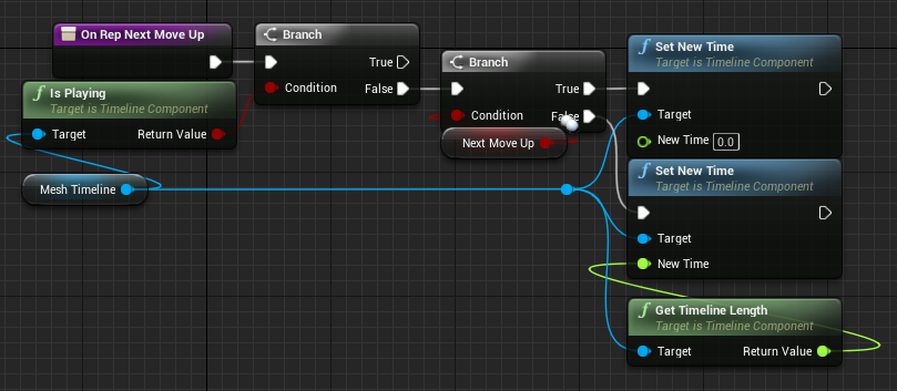 The first thing that we do is to check if the MeshTimeline component is in fact playing. If it’s not moving, we need to replicate the end-location of the two possible situations (Either it’s on the ground or it has moved up). To that effect, we use the “Get Timeline Length” and set that variable as the New Time in the MeshTimeline component.