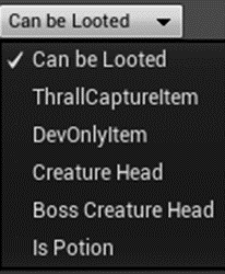 Gameplay Tags - This allows you to set what meta-tags you want for the item. There is a separate guide on what these are and how they work; Suffice to say here that this is another way of identifying and grouping items. You may have to restart the editor between adding new entries to the GameplayTags Table before you can use them in the Itemtable.