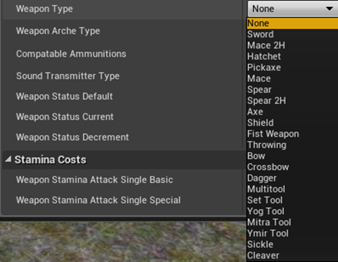 Sound Transmitter Type - This value links the item-table to the SoundFunctionLibrary and tells it what type of impact sound to play when hit. The process is a bit long to go through for this primer, but the WeaponMaterialTable is a table that have entries that look like this: "AxeSpecial_14" - the 1 in that name is taken from the weapon physical surface data and the 4 in that name is the material of the armor. Together, they determine what sound the weapon/tool should make.
