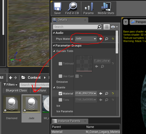 We're going to need to switch the material for the mesh to new one - this isn't just a visual change; we are doing this in order to link the new material to a Physical-Material, which is what the engine checks to determine what resources should drop from the node. For this guide, we’ll assume that you want to use the same visual look, so we’ll just make copies of the material as well.