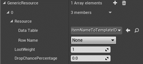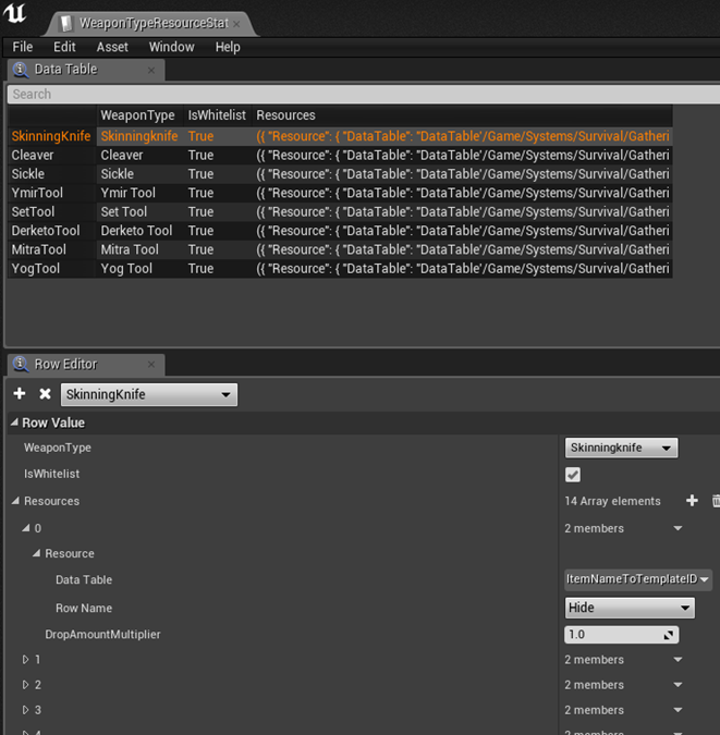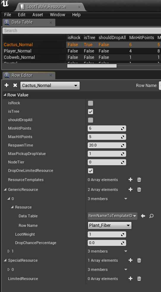 Open the "LootTable_Resource" table and create a new entry here. This entry must have the same row-name as our created physical material.