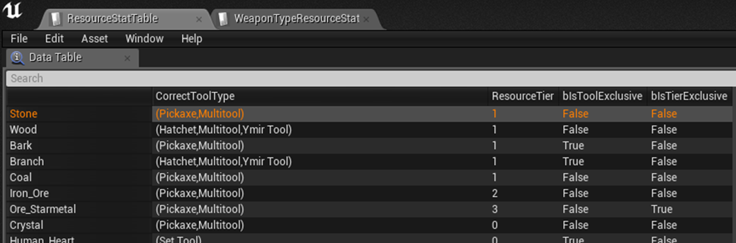 blsToolExclusive - Check this if you want the resource to only be allowed for the specific tools listed in CorrectToolType. Note: There have been some issues with this functionality, which led to the implemntation of a second table called "WeaponTypeResourceStatTable", more about this table below.