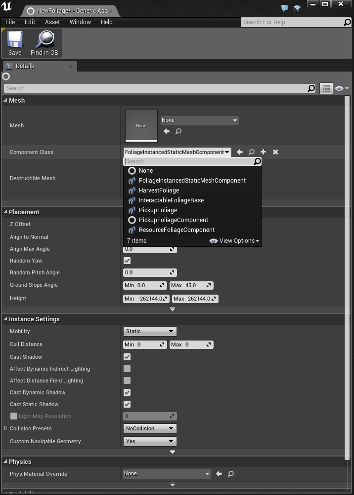 This section allows you to set up what mesh and destructible mesh you will be using for your foliage. Also - very importantly - it allows you to set up if your foliage should be harvestable or pickups.