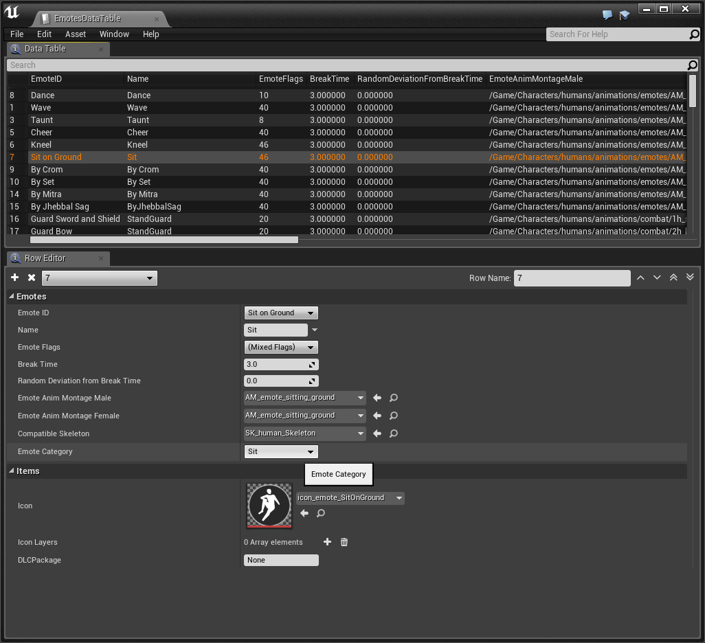 EmoteCategory - used to split emotes in categories in the player emote radial menu and the follower emote radial menu. Please note that emotes will be moved into the category submenu only if there is more than one emote from the same category available in the radial menu. Emote categories are set up in the /Game/UI/RadialMenus/EmoteCategoriesTable data table. Available EmoteCategory are based on the EEmoteCategoriesenum, that can be extended only from Code (EmoteTableRow.h).