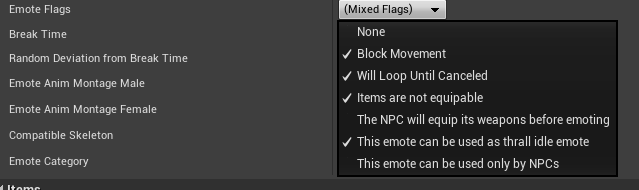 IsThrallIdleEmote - marks emotes that can be assigned by players to their followers in the followers emote menu. Please not that players still have to learn that emote to access it in the followers emote menu.
