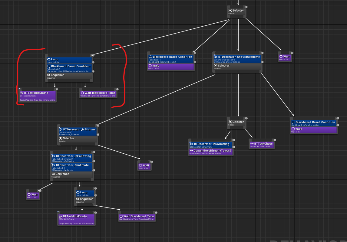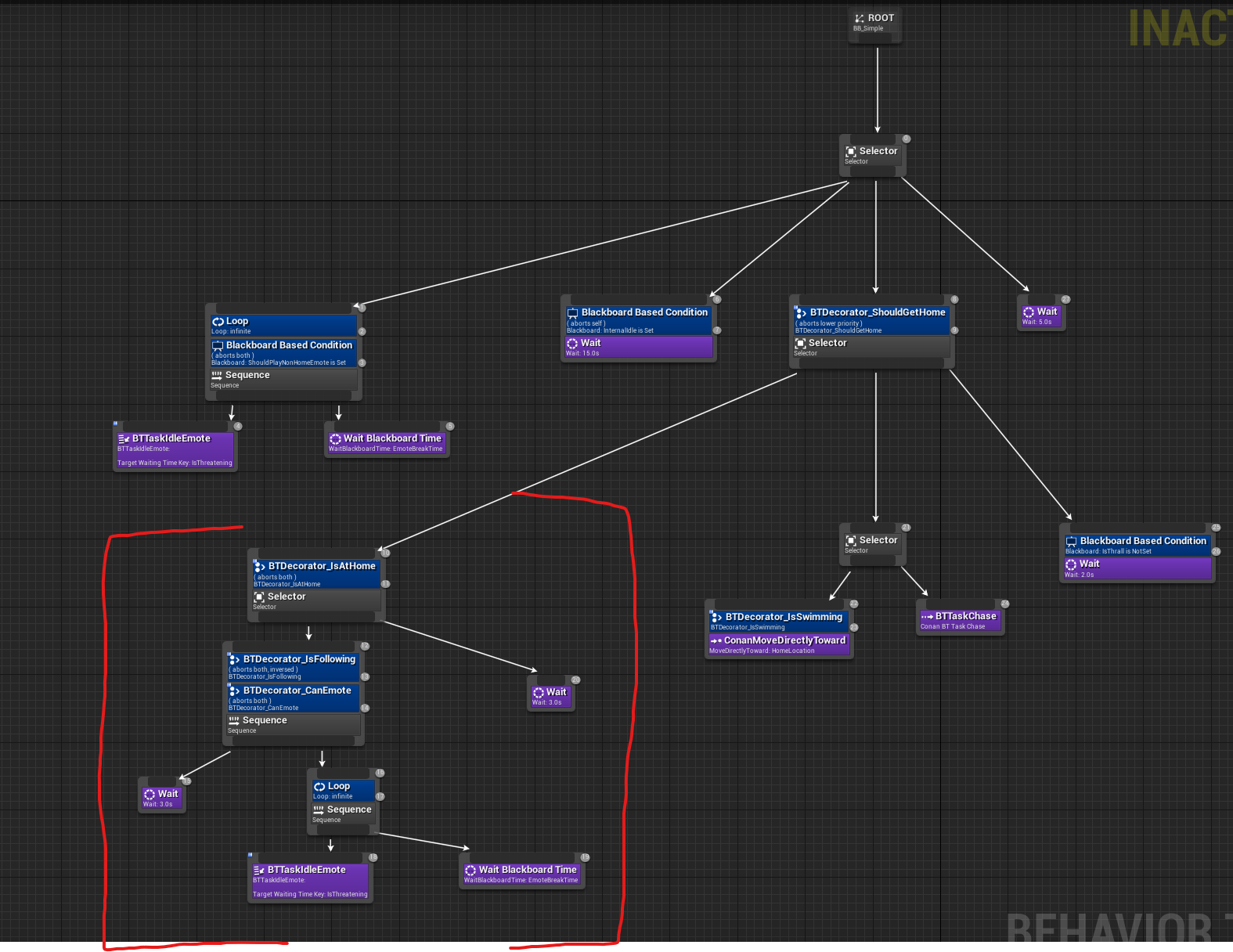The PlayEmote async node will try to start to emote on the target character once. This behavior is controlled from the BT_Passive behavior tree: