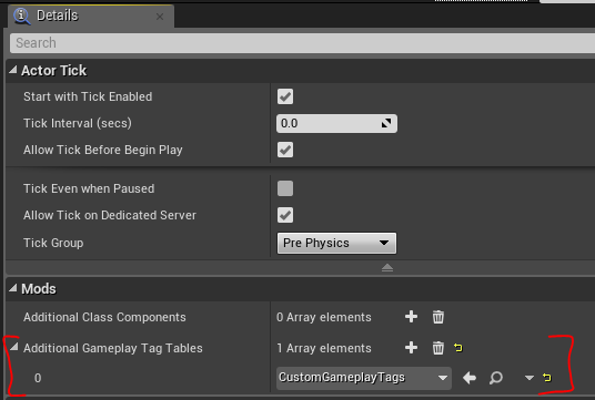 Next we link to the table from the ModController by adding it to the AdditionalGameplayTagTables. Save and compile the ModController and the tags are ready to use.