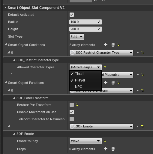 Thralls : The thrall system component will be the one handling the smart object system. When moving or placing a thrall, it will display all of the available smart object slots in proximity using ghost humanoids. When the placement brush gets close, placing the thrall will immediately trigger using the slot.