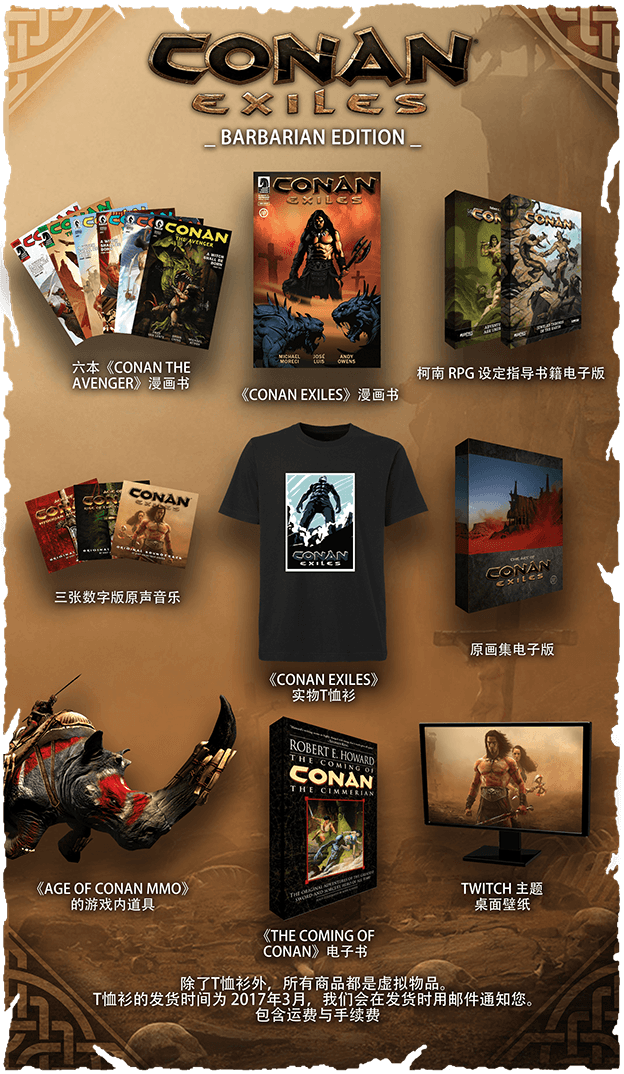 Funcom 同时非常高兴地公布《Conan Exiles》Barbarian 版!这个特别版会详细介绍野蛮人柯南的世界,其中包含如下物品: